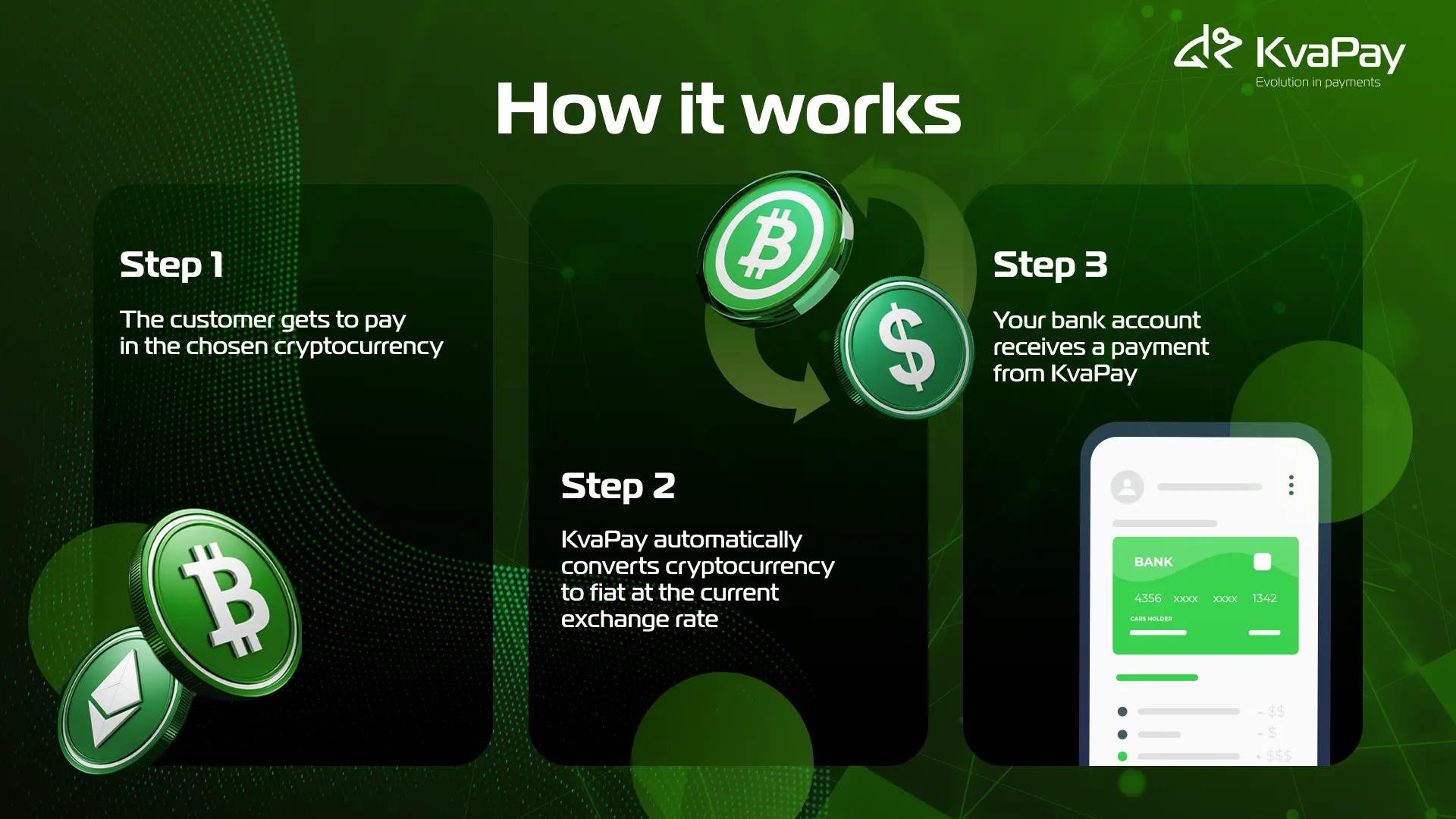 Our KvaPay Crypto gateways excel at converting digital currencies into traditional money right away. Businesses can now accept cryptocurrency payments without keeping digital assets on their balance sheets. The gateway handles everything and deposits the money straight into the merchant's bank account.