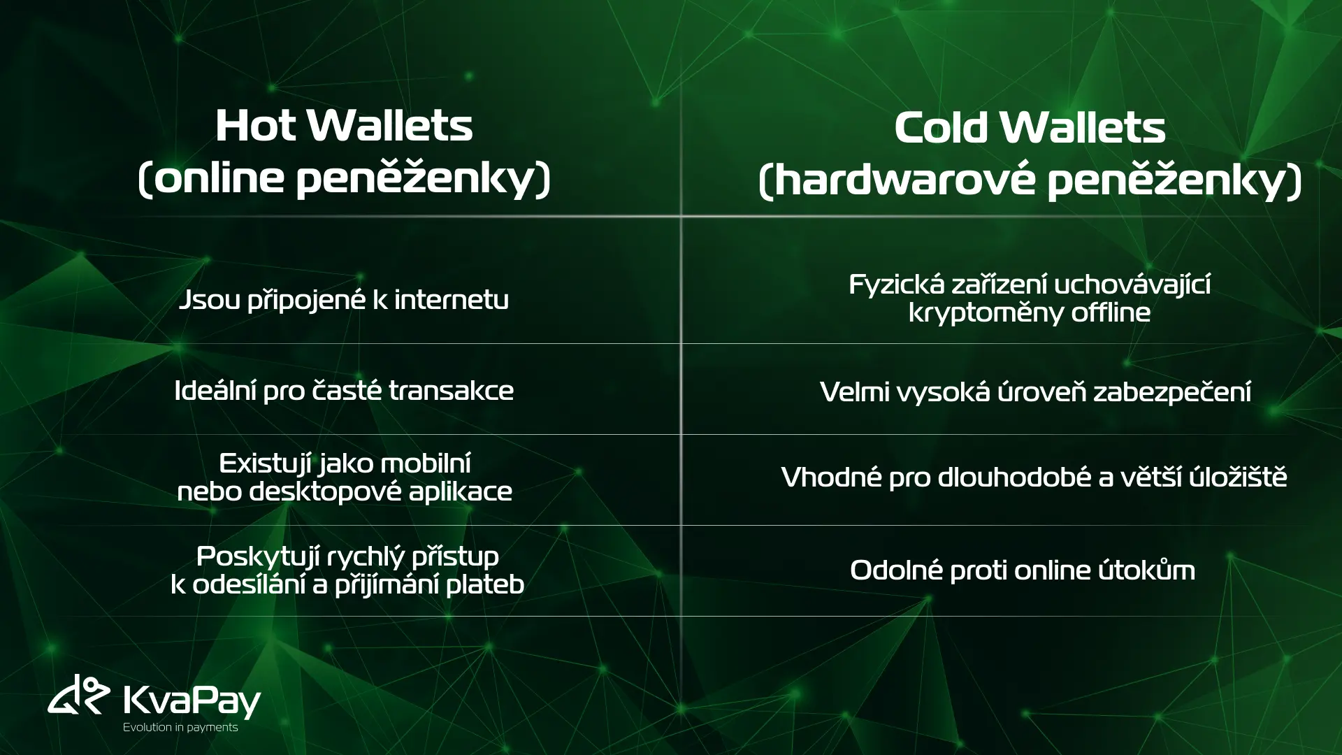 Kombinace hot a cold wallet poskytne ideální rovnováhu mezi praktickým použitím a zabezpečením. Naše společnost KvaPay nabízí kompletní řešení: kryptoměnovou peněženku, POS terminál, i platební odkazy, díky kterým je placení kryptem stejně jednoduché jako platba kartou.
