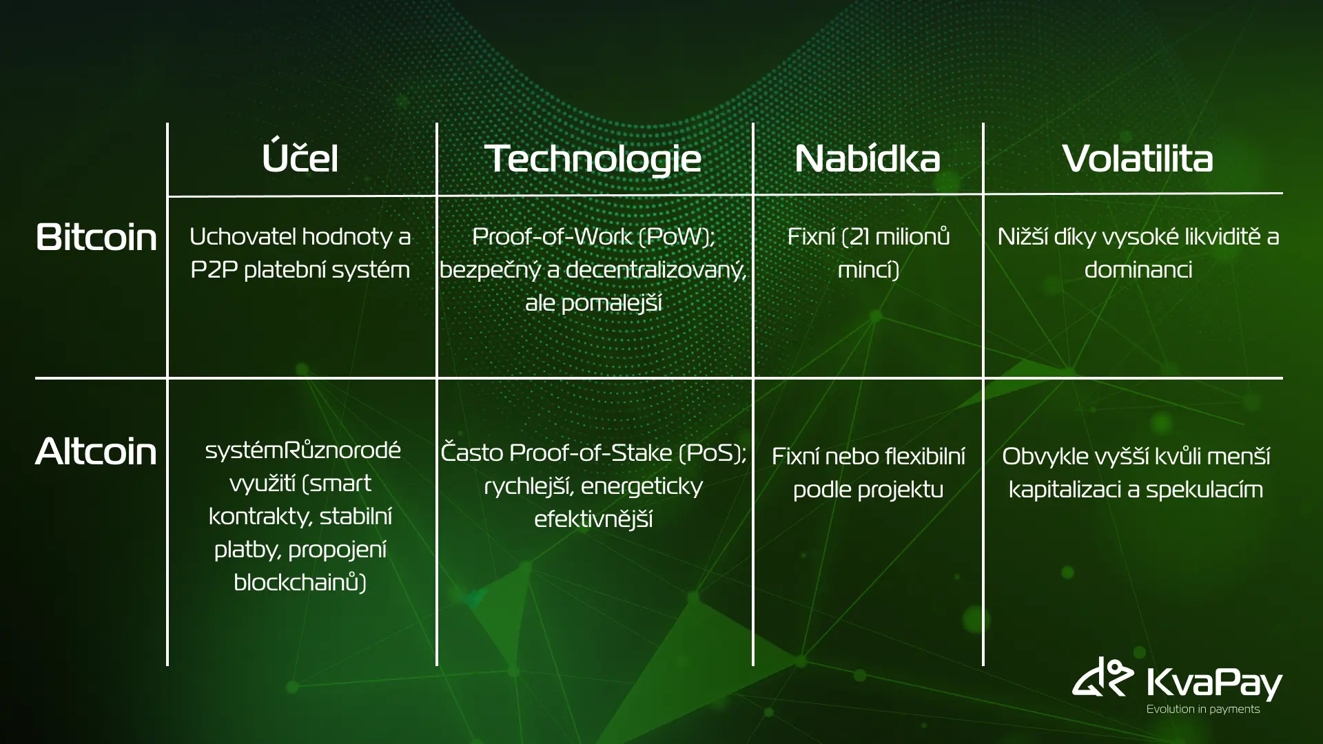 Bitcoin a altcoiny se liší v několika zásadních aspektech: