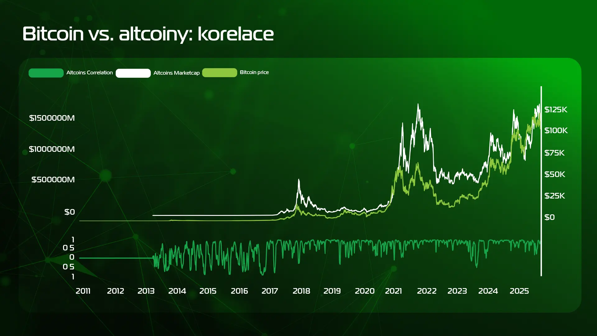 Historicky se pohyby altcoinů často řídí vývojem ceny Bitcoinu. Když se Bitcoin po výrazném růstu stabilizuje, investoři často hledají vyšší potenciální výnosy na trhu altcoinů. Tento vztah ukazuje roli Bitcoinu jako lídra trhu, jehož pohyby obvykle určují směr celého kryptoměnového sektoru.