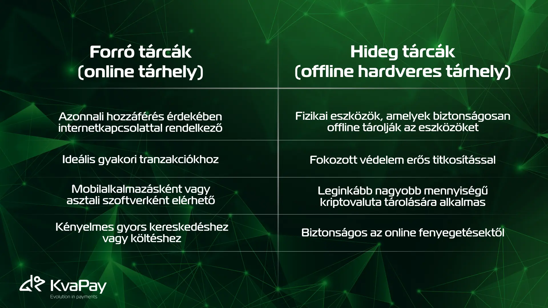 A rendszeres vásárlásokhoz használt forró pénztárcák és a nagyobb összegek hideg tárolásának kombinációja a kényelem és a biztonság tökéletes egyensúlyát biztosítja. A KvaPay mindent az egyben megoldása – beleértve a kriptovaluta-pénztárcát, a POS-terminált és a fizetési linkeket – a digitális valuta-tranzakciókat ugyanolyan egyszerűvé teszi, mint a hagyományos fizetéseket.