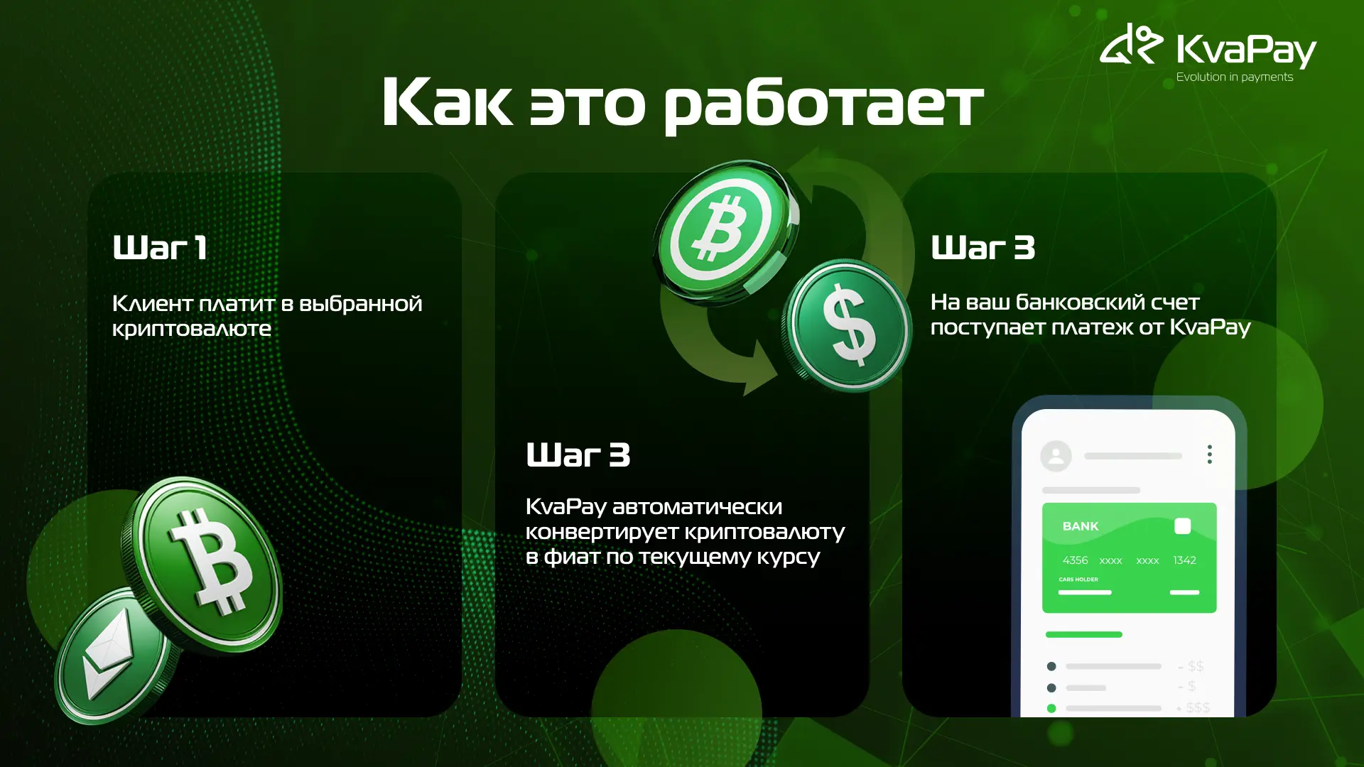 Наши криптоплатежные шлюзы KvaPay превосходно справляются с срочной конвертацией цифровых валют в традиционные деньги. Теперь бизнес может принимать криптовалютные платежи, не храня цифровые активы на своих балансах. Шлюз берет все процессы на себя и перечисляет средства напрямую на банковский счет продавца.