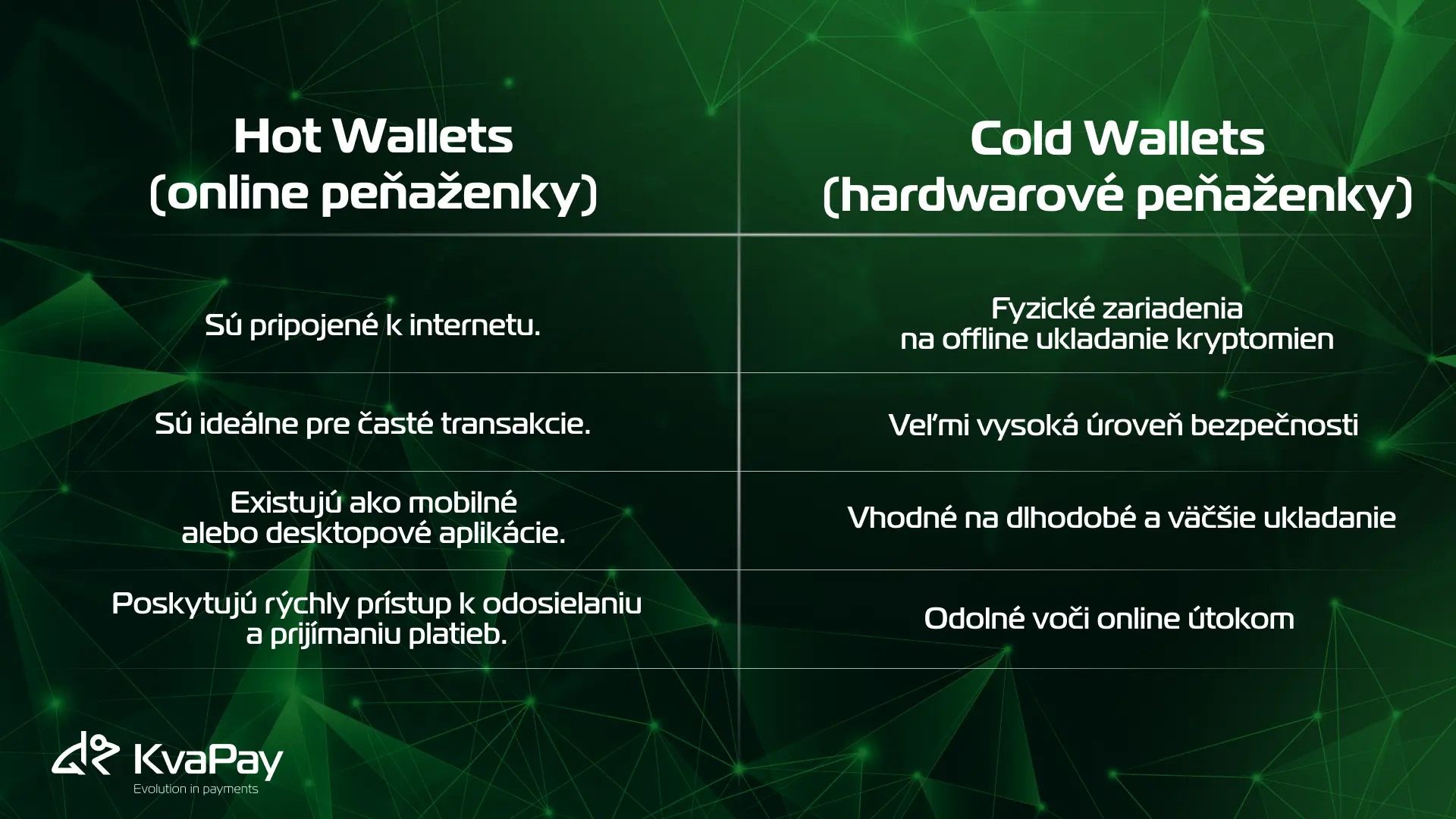 Kombinácia horúcich a studených peňaženiek poskytuje ideálnu rovnováhu medzi praktickým využitím a bezpečnosťou. Naša spoločnosť KvaPay ponúka komplexné riešenie: peňaženku na kryptomeny, POS terminál a platobné odkazy, vďaka ktorým je platba kryptomenami rovnako jednoduchá ako platba kartou.