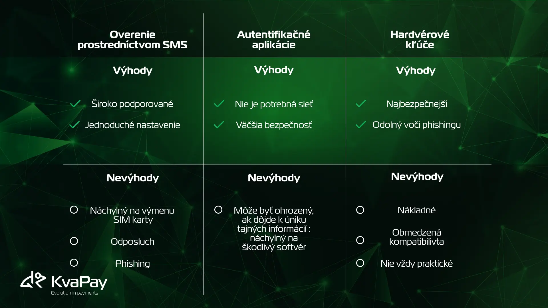 V KvaPay dôrazne odporúčame používateľom, aby povolili 2FA a zvážili hardvérové možnosti pre citlivé transakcie. Vaša digitálna identita je len taká bezpečná, ako metódy, ktoré používate na jej ochranu.